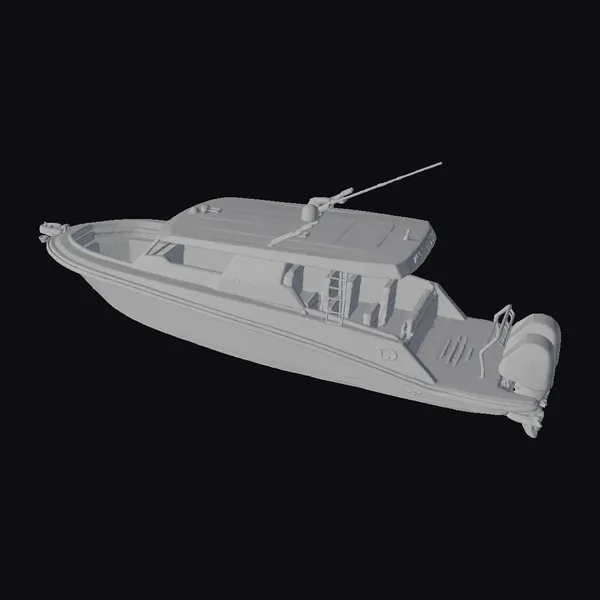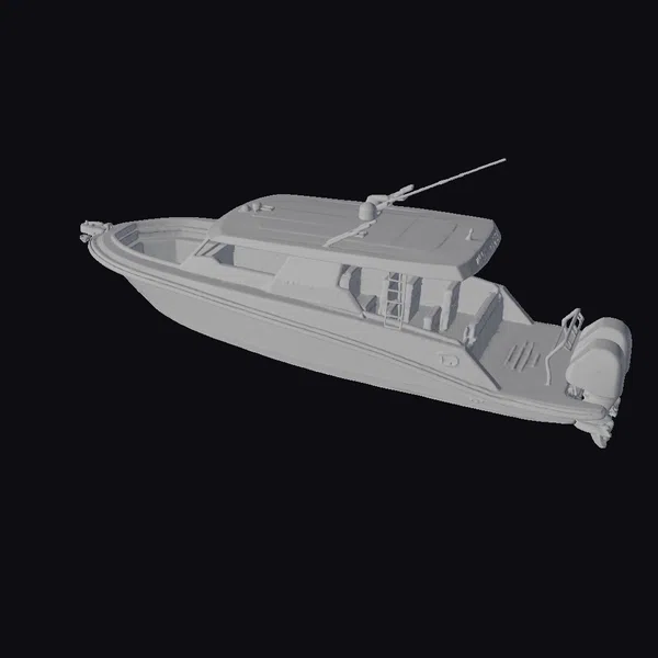 Positioned at a dynamic angle, this stunning boat model showcases its impressive design features. The metallic gray and white color scheme gives the boat a premium look, while the expansive windshield and sleek lines convey a sense of speed and agility. A black motor at the rear and a long antenna on the roof add a hint of ruggedness and functionality. The boat’s interior is partially visible, revealing a spacious cabin. This model is perfect for use in games, 3D printing, VR/AR experiences, animation, and design projects, offering a versatile and visually appealing asset.
