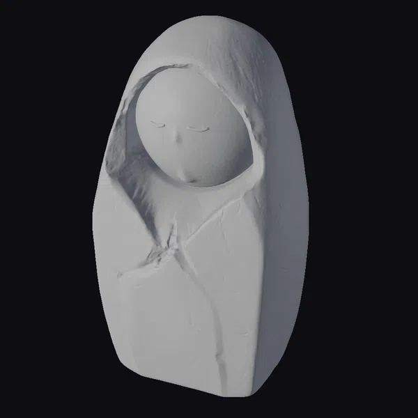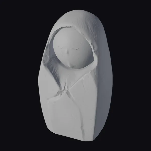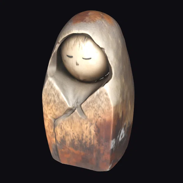 Gazing upon this figurine, you’re drawn to the tranquil pose of the sleeping child, enveloped by a hood that resembles stone. The stylized artwork showcases a unique blend of soft, pastel colors and earthy tones, creating a dreamy atmosphere. The child’s serene expression and the abstract, rounded form of the hood invite contemplation. This model is perfect for use in games, 3D printing, VR/AR experiences, animation, and design projects where a touch of whimsy and peacefulness is desired.