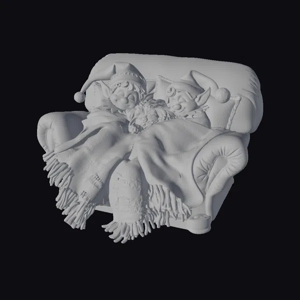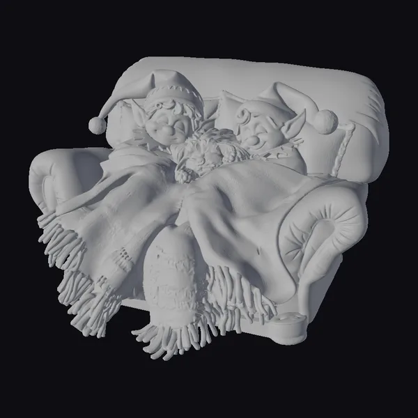 This charming scene features two sleepy elves and a puppy snuggled up on a brown couch, adorned with vibrant red and green blankets and matching pillows. The elves wear traditional Christmas attire, complete with hats and cozy outfits. The puppy rests comfortably between them, adding to the warmth of the scene. The stylized 3D model boasts intricate details, from the textures of the blankets to the peaceful expressions on the elves’ faces. Ideal for use in animations, games, or designs where a festive and heartwarming atmosphere is desired.