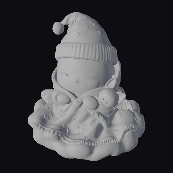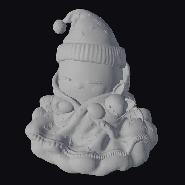 In a serene pose, the ghost sits comfortably, its eyes gently closed as it holds a small bat close. The ghost’s white face glows softly, complemented by rosy cheeks and a subtle smile. Its purple nightcap, adorned with yellow stars and a white pom-pom, matches the starry blanket wrapped around its body. The blanket’s folds are meticulously detailed, with a subtle sheen suggesting a soft, dreamy texture. The ghost’s base is a smooth, gray cloud-like shape, adding to the ethereal atmosphere. This model is perfect for use in games, animations, or 3D prints, where its whimsical charm can be fully appreciated.