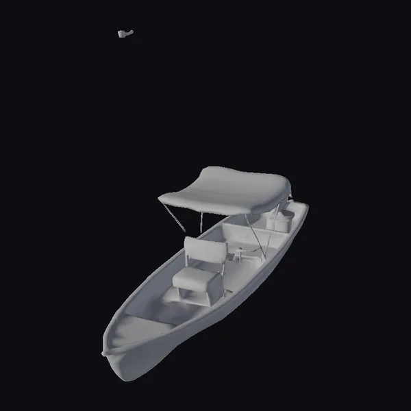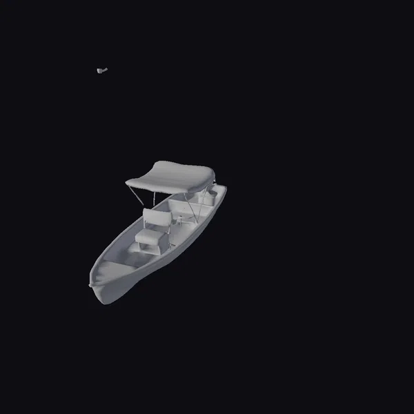 Positioned at a slight angle, the boat’s wooden hull gleams with a rich, brown finish, complemented by a vibrant blue interior that adds a pop of color. The beige canopy, supported by slender metal poles, provides shade and protection from the elements. Two white seats are neatly arranged beneath, inviting relaxation. The boat’s proportions are meticulously detailed, from the curvature of the hull to the texture of the seats. Ideal for use in games, 3D print projects, VR/AR experiences, animations, or design visualizations, this model brings a touch of tranquility to any scene.