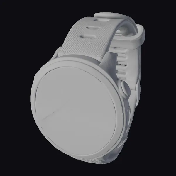 Detailed with precision, the smartwatch display presents a black face with a prominent green digital readout at its center. Above the readout, a stylized white icon adds a touch of sophistication. The watch’s textured black strap and silver clasp provide a sleek contrast to the digital face. Surrounding the display are various markings and indicators, adding to the device’s high-tech appearance. This model is perfect for projects requiring a modern, wearable tech aesthetic, suitable for use in games, animations, or design applications.