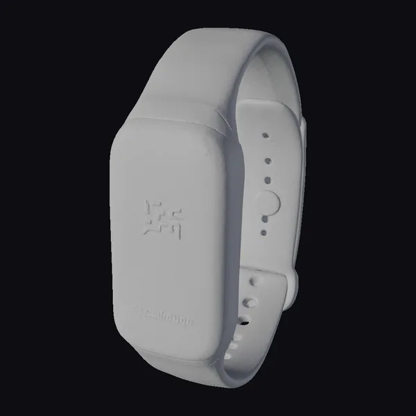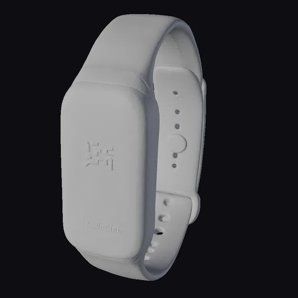 Positioned at an angle, the smartwatch showcases its rounded rectangular face with a glowing blue logo at its center. The screen’s subtle curvature and the strap’s perforations add to the device’s premium feel. The glowing emblem and digital text at the bottom of the screen create a captivating visual effect. Ideal for use in tech-related projects, such as animations, games, or VR/AR experiences, this model can also serve as a stylish accessory in design visualizations. Its modern aesthetic makes it a versatile asset for various applications.