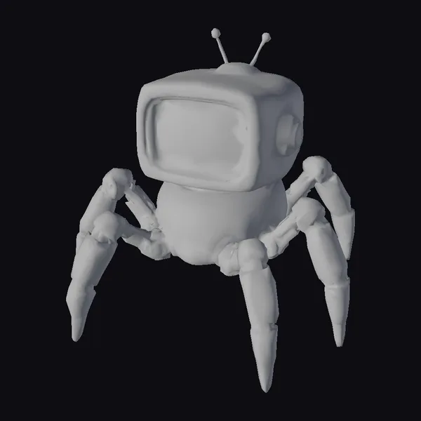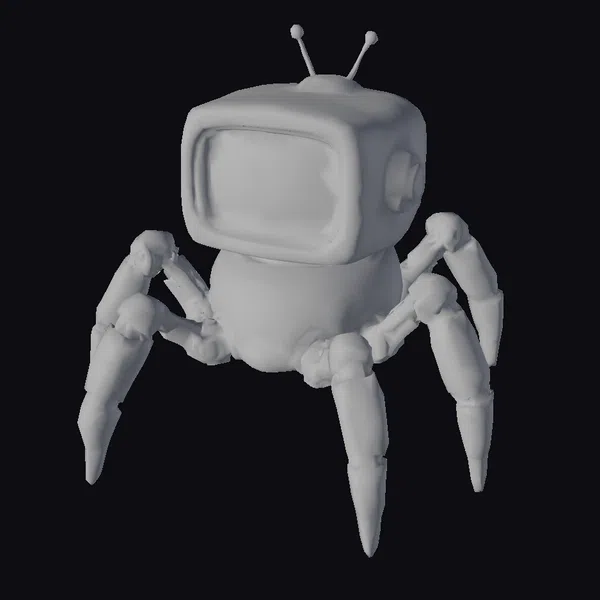 This stylized robot features a vibrant yellow and metallic body with a distinctive television head that showcases a cheerful smiley face. Its design is reminiscent of a spider, with multiple arms and legs that end in sharp metallic tips, suggesting a blend of utility and playfulness. The robot’s body is adorned with cracked textures and metallic accents, adding to its unique aesthetic. The television head is equipped with two small antennae on top, enhancing its quirky appearance. This model is perfect for projects requiring a friendly, futuristic character, such as animations, games, or virtual reality experiences.
