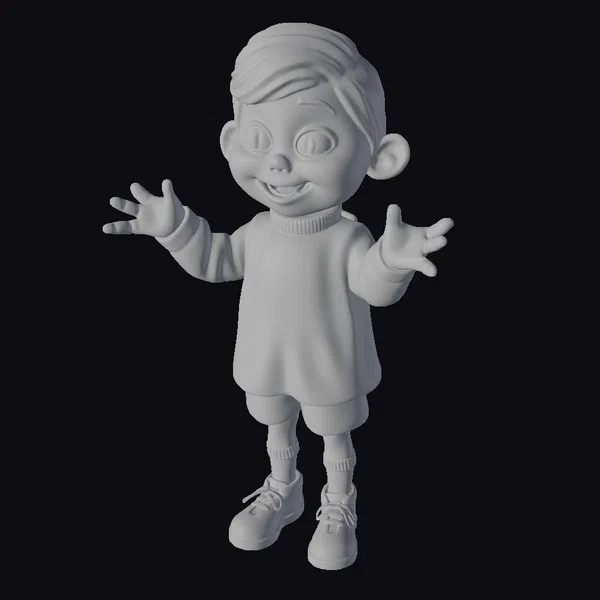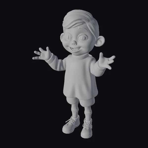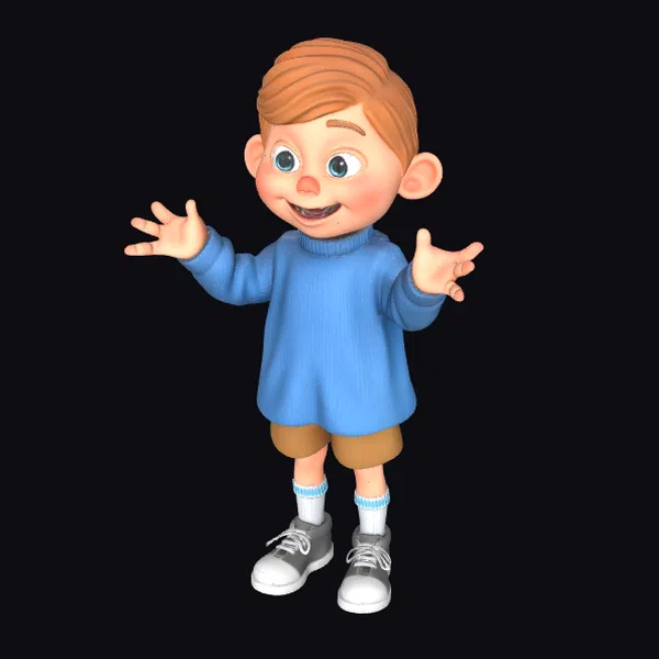 This delightful 3D model depicts a young boy with a joyful expression, showcasing a blue sweater, brown shorts, and gray sneakers. His short, reddish-brown hair and wide blue eyes contribute to his charming and approachable demeanor. The model is posed with arms outstretched, palms up, in a gesture of excitement or inquiry. The bright and colorful appearance, combined with a slightly stylized realism, makes this character suitable for various applications, including animation, game development, virtual reality experiences, and print media. The model’s details, such as the texture of the sweater and the laces on his sneakers, add to its usability in high-quality projects.