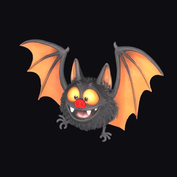 This delightful cartoon bat is captured in a dynamic pose, with its wings spread wide and a huge smile plastered on its face. The bat’s black fur and orange wings create a striking contrast, while its bright red nose and big, shiny eyes add a touch of whimsy. The model’s intricate details, from the texture of its fur to the shape of its wings, make it perfect for bringing a playful touch to games, animations, or 3D designs. Its friendly demeanor and vibrant colors are sure to captivate audiences of all ages.