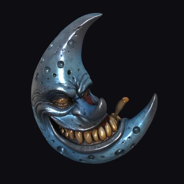 This fantastical crescent moon face boasts a vibrant blue metallic finish, complete with detailed craters and a wide, toothy grin. The eye, a piercing brown, seems to gleam with mischief, while a cigar adds a touch of whimsy to the overall design. The model’s texture and lighting create a sense of depth and dimensionality, making it perfect for use in games, 3D printing, VR/AR experiences, animation, and design projects. Its unique blend of playfulness and menace makes it a standout addition to any project.