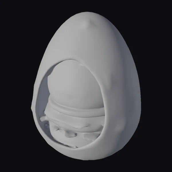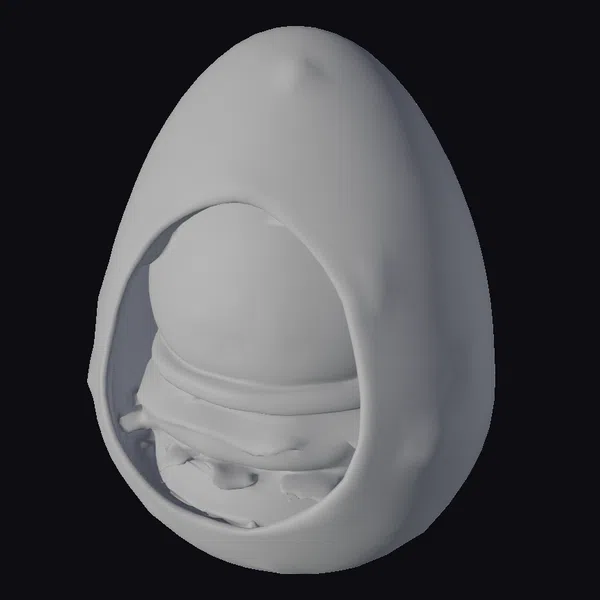 In a delightful fusion of food and character, a smiling burger pokes its head out from a white eggshell adorned with colorful spots. The burger’s yellow bun is accentuated with rosy cheeks and a beaming smile, its closed eyes suggesting contentment. The brown patty and green lettuce add a pop of contrast to the cheerful scene. This charming model is perfect for games, animations, or designs requiring a quirky touch. Its playful demeanor and whimsical design make it an eye-catching addition to any project.
