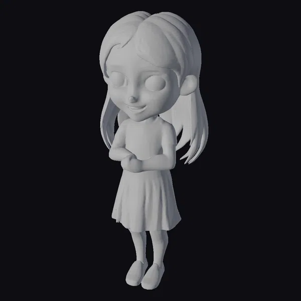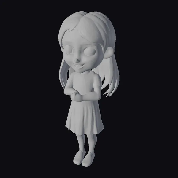 Standing with her arms crossed, this cartoon girl exudes a sense of youthful energy and friendliness. Her long blonde hair cascades down her back, framing her rosy cheeks and bright smile. The pink dress, complete with a white collar, is a delightful contrast to her blue shoes, adding a pop of color to her overall appearance. Her big eyes sparkle with joy, making her a delightful addition to any project. Textured with care, her features are smooth and inviting. She can be used in various applications, such as animations, games, or even 3D printing, bringing a touch of whimsy and delight to your creations.