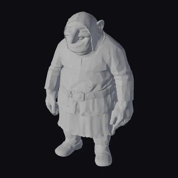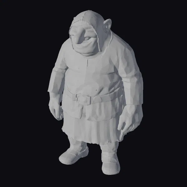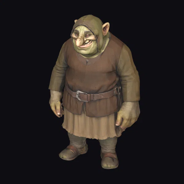Standing with a relaxed posture, this ogre’s facial features are the immediate focal point, thanks to his wide, cheerful smile and sharp teeth. His green skin has a subtle texture, suggesting a weathered complexion. The earthy tones of his outfit, including a brown tunic, belt, and sandals, complement his natural hues. The hood adds depth to his character, suggesting a readiness for adventure or a simple, rustic lifestyle. This model is perfect for projects requiring a friendly, approachable ogre, suitable for games, animation, VR/AR experiences, and design projects.