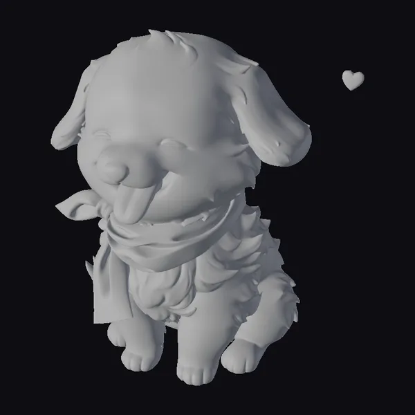 Detailed with precision, this charming puppy model showcases a fluffy yellow fur texture, complemented by a soft purple scarf elegantly wrapped around its neck. The puppy’s pose, with its tongue playfully out and cheeks blushing, captures a heartwarming scene. The small pink heart floating nearby adds to the affectionate ambiance. Ideal for projects requiring a lovable character, this model is suited for animations, games, and various design applications where a cute, friendly vibe is desired.