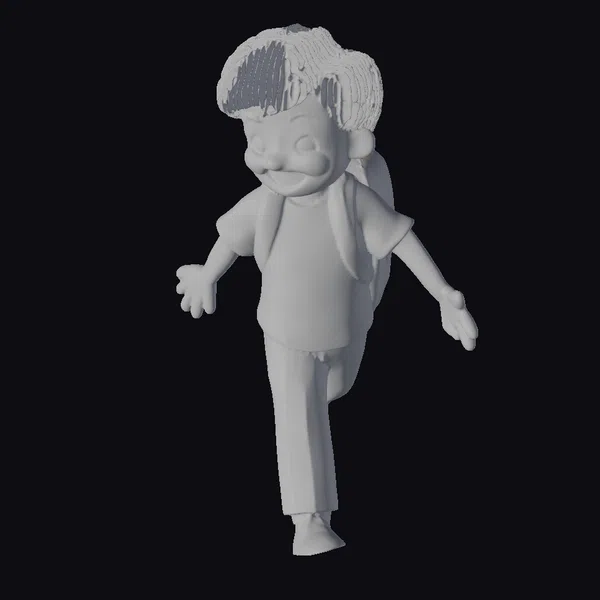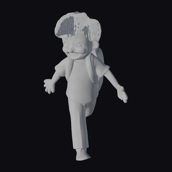 Detailed with precision, this cartoon boy model showcases a dynamic pose, with one leg bent in mid-step and arms stretched out to the sides, exuding a sense of movement and energy. His facial features are defined with a wide smile and expressive eyes, set against a backdrop of smooth, dark hair. The textures of his white t-shirt and red pants are subtly defined, while his blue and red backpack adds a pop of color. This model is perfect for projects requiring a youthful, animated character, suitable for animation, games, VR/AR experiences, and educational content.