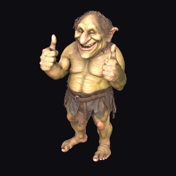 Standing with a confident stance, this detailed troll model showcases a blend of realism and fantasy. The figure’s green skin has a slightly rough texture, complemented by brown hair that’s tousled and unkempt. Its facial expression is one of playful amusement, with a wide grin and sparkling eyes. The troll’s physique is muscular, with defined arms and legs that suggest strength and agility. It wears a pair of torn shorts held up by a worn leather belt, adding to its rugged charm. The model’s pose, with both hands pointing towards the viewer, creates a sense of engagement and interaction. This level of detail makes the model suitable for various applications, including game development, animation projects, and virtual reality experiences. Its high-quality design ensures that it will integrate seamlessly into any fantasy or adventure-themed environment.
