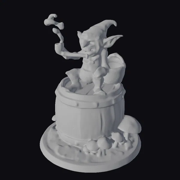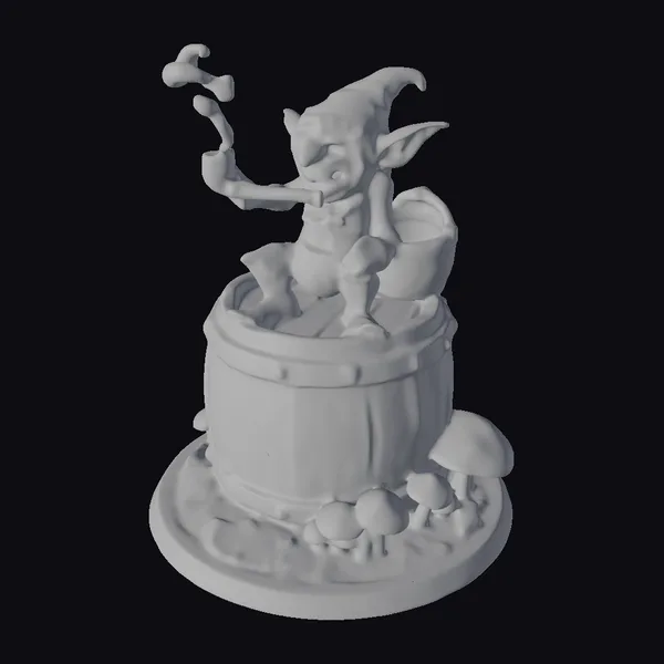 In a whimsical pose, a green goblin sits atop a large, weathered wooden barrel, its surface adorned with metal bands and wooden slats. The goblin’s pointed hat and wide, toothy grin contribute to its playful appearance, as it puffs on a long, curved pipe, releasing tendrils of smoke. The barrel itself is surrounded by a cluster of small, brown mushrooms and a patch of vibrant green moss, creating a sense of organic growth. A wicker basket, partially hidden behind the goblin, adds to the scene’s rustic charm. This 3D model is perfect for use in fantasy settings, such as games, animations, or 3D printing projects, where a touch of whimsy and humor is desired.