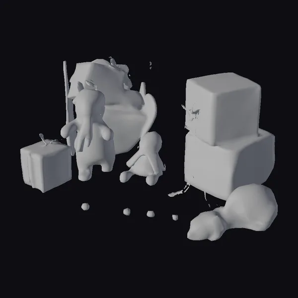 In a whimsical winter scene, three snowmen of varying sizes are gathered around a festively decorated sleigh, heaped with an assortment of brightly wrapped presents. The snowmen, adorned in rainbow-striped scarves and matching hats, radiate joy and festivity. The largest snowman stands beside the sleigh, while a smaller companion looks on, and a third playfully dives into the snow. The scene is set against a clean white backdrop, emphasizing the colorful textures of the gifts, sleigh, and snowmen’s attire. Ideal for adding a touch of holiday magic to games, animations, or designs, this model captures the essence of a merry winter celebration.