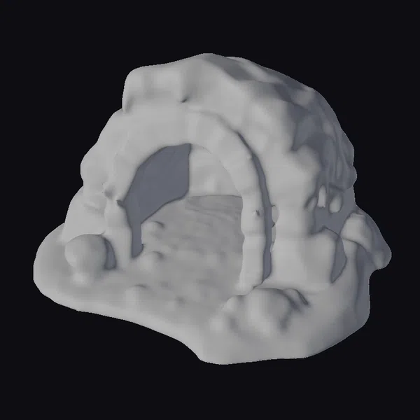 Deep within a frosty landscape, a majestic stone cave entrance beckons, its rugged beauty crafted in a stylized 3D model. The structure’s stone blocks are weathered to perfection, covered in a blanket of snow and adorned with icicles that hang precariously from the roof. A warm, inviting light spills out from within, casting a glow on the snow-covered ground. The model’s intricate details make it perfect for use in games, 3D printing, VR/AR experiences, animation, and design projects. Its unique blend of fantasy and realism will transport your audience to a magical winter world.