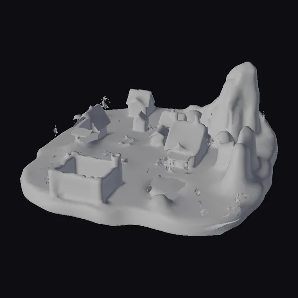 Perched atop a frozen terrain, a cluster of snow-covered houses forms a quaint village, surrounded by an imposing ice wall that rises majestically to the right. The houses, with their wooden textures and snow-clad roofs, exude a sense of warmth and coziness, while the icy landscape and powdery snow drifts evoke a sense of serenity and isolation. The village’s centerpiece is a stone wall with a chimney, emitting gentle wisps of smoke, adding a touch of life to this winter wonderland. This 3D model is perfect for games, animation, and design projects seeking a magical, snowy setting.