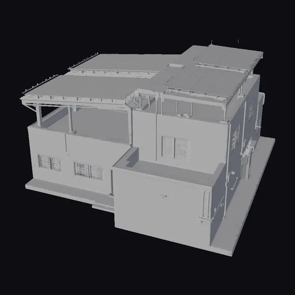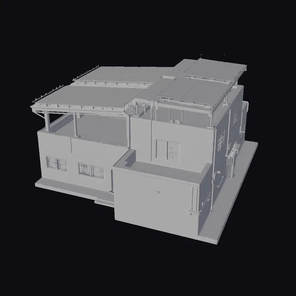 Detailed with precision, the solar-powered house model boasts a sturdy wooden base, supporting a two-story structure with a flat roof. The rooftop is adorned with a grid of black solar panels, angled for optimal energy absorption. The house’s exterior is finished in a warm taupe hue, complemented by crisp white trim around the windows and doors. A clothesline with blue garments on the right side adds a touch of domesticity. This model is perfect for architects, designers, and environmentally conscious individuals looking for a 3D representation of sustainable living. Its detailed design makes it suitable for various applications, including games, 3D printing, VR/AR experiences, animation, and design projects.