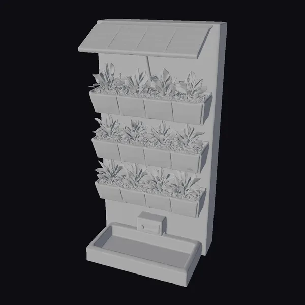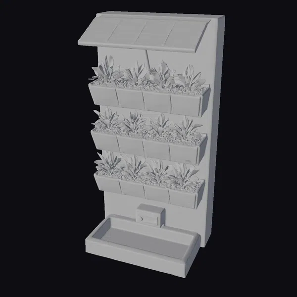 Detailed in every aspect, the model features a sturdy beige frame supporting four rows of vibrant, terracotta-colored planters, each filled with a variety of green plants. A sleek solar panel at the top provides power, while a small tray at the bottom for collecting water or debris adds functionality. The model’s textures and lighting highlight its modern and eco-friendly appeal. Ideal for use in games, 3D printing, VR/AR experiences, animation projects, and architectural designs focusing on sustainable living.