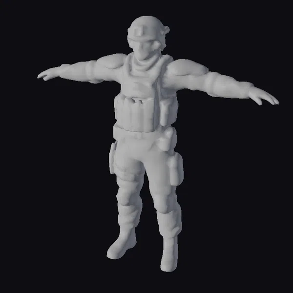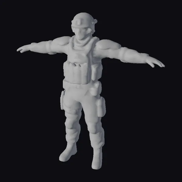Detailed from head to toe, this soldier model showcases an impressive array of military gear, including a camouflage helmet, tactical vest with multiple pouches, and knee and elbow pads for added protection. The uniform’s fabric texture and the soldier’s facial features are rendered with high precision, capturing the intensity and readiness of a combatant. The model’s pose, with arms outstretched and feet shoulder-width apart, conveys a sense of balance and stability, making it ideal for use in games, animations, or as a reference for design projects. Its realistic style ensures it will blend seamlessly into any modern military-themed scene.