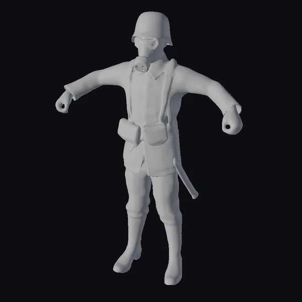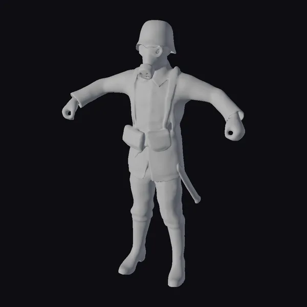 Standing tall with arms outstretched, this meticulously crafted soldier model embodies the essence of military preparedness. The gas mask, complete with a green helmet and protective eyewear, adds an air of mystery and danger. The uniform, adorned with a red emblem on the shoulder, appears worn from countless battles, while the brown leather belt and holstered sidearm accentuate the soldier’s combat-readiness. This 3D model is perfect for projects requiring a realistic historical military presence, such as games, animations, or historical documentaries. Its detailed textures and lifelike pose make it an invaluable asset for any creative endeavor.