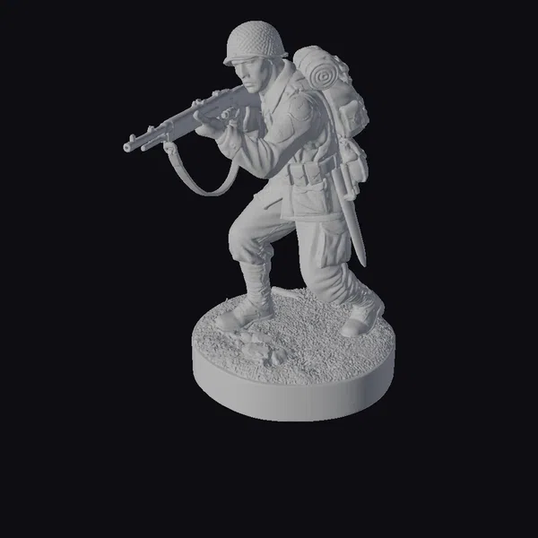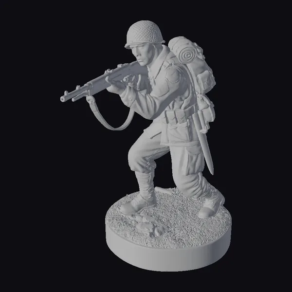 Positioned in a dynamic crouching stance, this soldier model is meticulously detailed, from the fatigue on his uniform to the gear strapped to his back. The assault rifle, held firmly in his hands, draws the viewer’s eye. Textured with care, the model showcases a realistic military appearance, suitable for projects requiring a historical or modern military presence. The base, textured to resemble dirt and small rocks, enhances the overall immersion. Ideal for use in games, animations, or designs where a military theme is needed, this model brings authenticity and action.