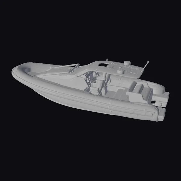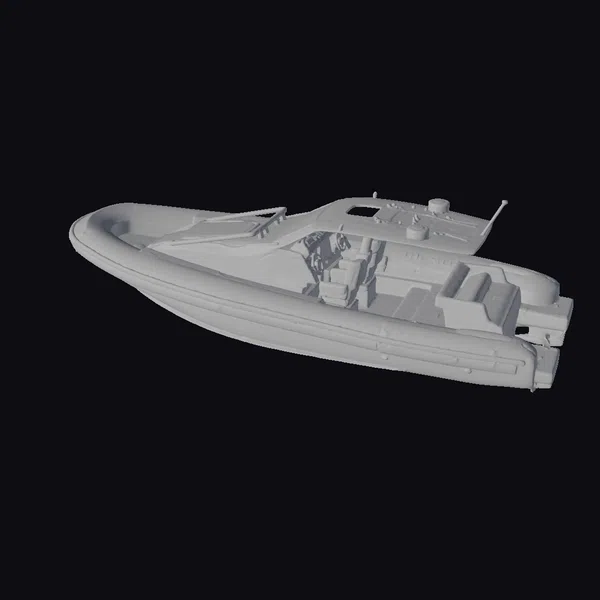Positioned in a dynamic pose, this speedboat showcases its impressive design and features. The hull is predominantly white with a black lower section and a distinctive black and red stripe running along the rear. Two red caps are visible on the upper deck, adding a pop of color. The boat’s interior is detailed with white and black elements, highlighting its engine and cockpit. The model is highly detailed, with textures and lighting that bring out the sleek lines and shiny surfaces. Ideal for use in games, 3D environments, or as a design reference, this model captures the essence of a high-performance watercraft.