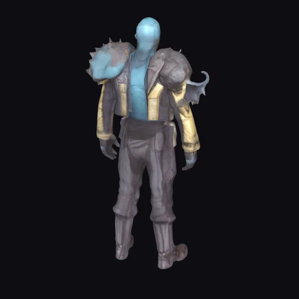 This detailed 3D model depicts a fantasy humanoid creature with a blue, bald head and torso. Its spiked shoulder armor and yellow sleeves with gray cuffs suggest a blend of sci-fi and fantasy elements. The character’s gray pants and dark boots are intricately designed, with visible weathering that adds to its rugged appearance. The model’s pose, with arms relaxed by its sides, showcases its menacing yet intriguing presence. Ideal for use in games, animation, VR/AR experiences, and design projects, this model is sure to capture attention. Its unique design and detailed textures make it a valuable asset for creators looking to add a touch of fantasy and sci-fi to their work.