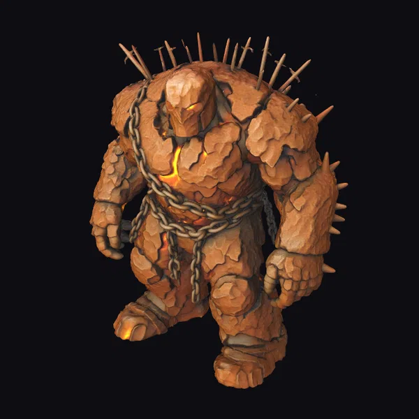 Standing imposingly with its feet shoulder-width apart, this spiked stone golem is a marvel of fantasy design. The intricate texture of its stone body, resembling rough-hewn boulders, is accentuated by the sharp spikes protruding from its back and shoulders. Heavy chains encircle its waist and arms, suggesting a history of captivity or subjugation. The golem’s face, though featureless, radiates an intimidating presence through its glowing yellow eyes and open mouth, revealing a fiery interior. This model is perfect for use in games, 3D printing, VR/AR experiences, animations, or designs requiring a mythical creature with a strong, chaotic presence.