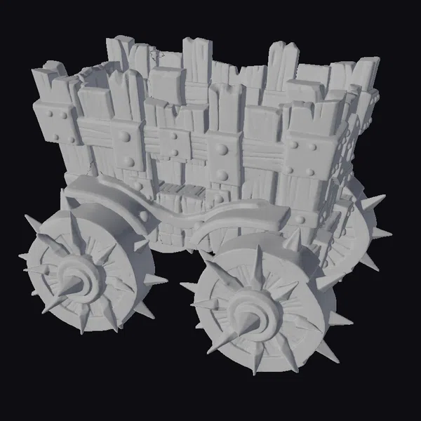 Perched on spiked wheels, this stylized siege chariot exudes a formidable aura, its wooden slats reinforced with metal bands secured by rivets. The vehicle’s design is accentuated by its chunky appearance, a hallmark of game art styles. The spiked wheels add a menacing touch, suggesting a vehicle designed for battle. The chariot’s structure appears sturdy, capable of withstanding harsh conditions on the battlefield. Its unique blend of wood and metal textures, coupled with the stylized spikes, makes it a compelling asset for projects requiring a fantasy or historical military feel, such as games, animations, or architectural designs.