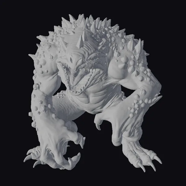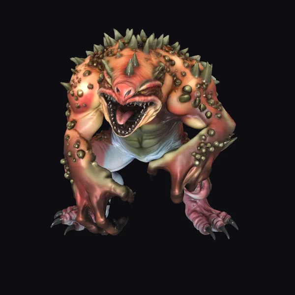 This fantastical creature is captured in a dynamic, crouched position, exuding a sense of imminent attack. The body is a mass of muscle, covered in sharp, green spikes and rounded bumps that add to its menacing appearance. The creature’s mouth is wide open, showcasing rows of sharp, white teeth, while its eyes seem to gleam with a fierce inner light. The skin coloration shifts from deep red on the face and arms to green on the torso and legs, creating a visually striking effect. The long, sharp claws on its hands are extended, ready to strike. This level of detail makes the model perfect for use in games, 3D printing, VR/AR experiences, animation, and design projects where a fearsome creature is needed.