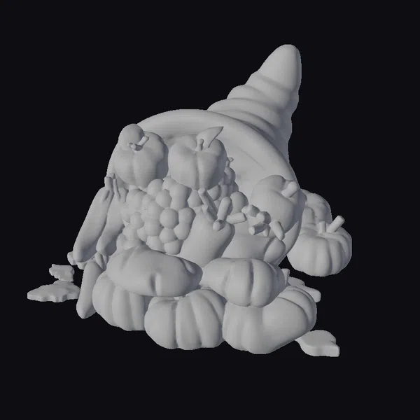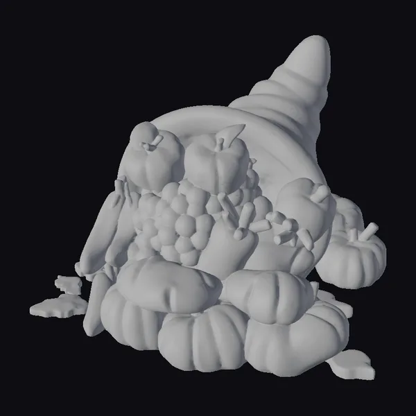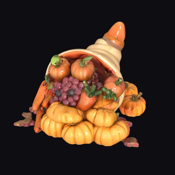 Gazing upon this magnificent cornucopia, your eyes are immediately drawn to the vibrant array of fruits and vegetables spilling out of its open end. The arrangement features a diverse selection of pumpkins in various sizes, their smooth, glossy surfaces reflecting light and showcasing intricate texture details. A cluster of plump, juicy grapes adds a pop of deep purple to the scene, while the cornucopia’s warm, golden color provides a cozy and inviting backdrop. Crafted with meticulous attention to detail, this 3D model is perfect for use in a variety of applications, including games, animations, and 3D printing. Designers and artists will appreciate the model’s high level of detail and realism, making it an excellent choice for projects that require a touch of autumnal charm.
