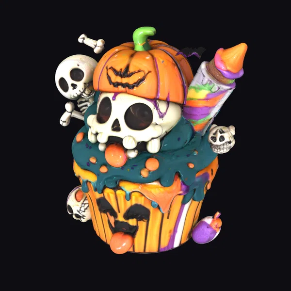 Detailed with precision, the cupcake boasts vertical orange stripes, flecked with purple and white accents, and is smothered in a rich turquoise icing that drips tantalizingly down its sides. A diminutive pumpkin hat, complete with a carved face, crowns a cheerful skeleton peeking out from the icing. Surrounding this central delight, tiny skeletons frolic and candies are strewn about, adding to the festive chaos. The model’s intricate details and vivid color palette make it perfect for use in games, 3D printing, VR/AR experiences, animations, or design projects seeking a touch of Halloween whimsy.