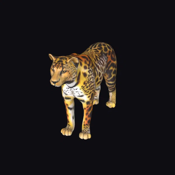 Crafted with meticulous attention to detail, this stunning feline model showcases a lifelike pose, with its body angled to the left and its head turned inquisitively. The intricate texture of its fur is a marvel, with a predominantly yellow base adorned with striking orange and black spots. The contrast between the spotted fur and the crisp white underbelly adds a touch of realism. Ideal for use in games, 3D printing, VR/AR experiences, animation, and design projects, this model brings a sense of wild beauty to any creative endeavor.