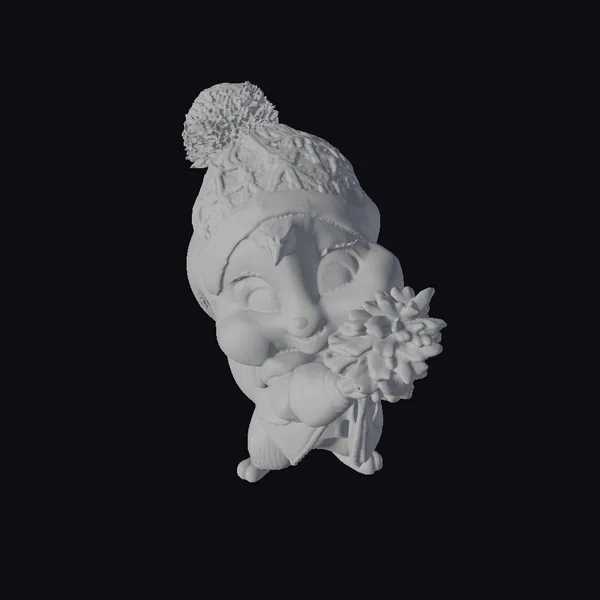 Standing on its hind legs, this endearing squirrel is dressed in a vibrant yellow outfit, complete with a matching hat adorned with a fluffy gray pom-pom. The hat’s gray trim frames the squirrel’s expressive face, which features large, shiny eyes and a tiny pink tongue peeking out. The squirrel’s arms are wrapped around a substantial pinecone, as if it’s eager to store it away. The model’s stylized features and textures make it an ideal choice for projects requiring a charming, cartoon-like character. Its small size and adorable appearance make it perfect for use in animations, games, or as a decorative element in 3D environments.