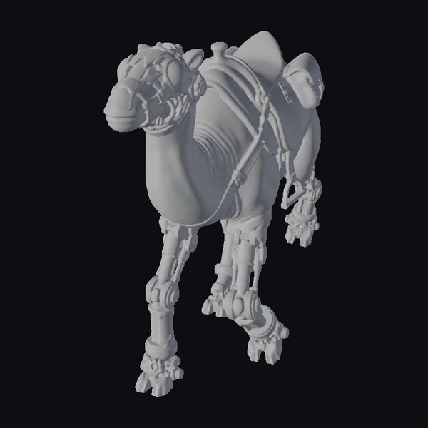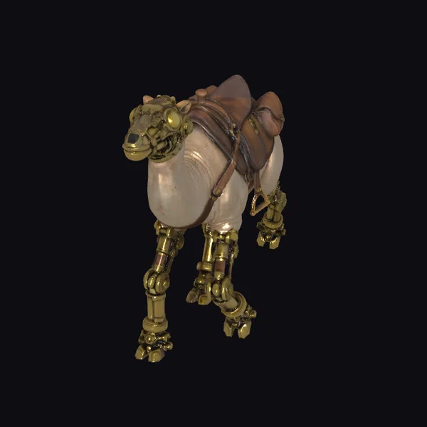 In a dynamic pose, the steampunk camel robot showcases intricate details, from the brass-plated mechanical legs to the leather-strapped saddle on its back. The goggles on its face add a touch of mystery and readiness for exploration. Its body, a mix of smooth camel-like features and industrial components, suggests a creature designed for both endurance and advanced functionality. This model is perfect for projects requiring a blend of fantasy and science fiction elements, such as games, animations, or architectural designs that seek a unique, futuristic aesthetic.