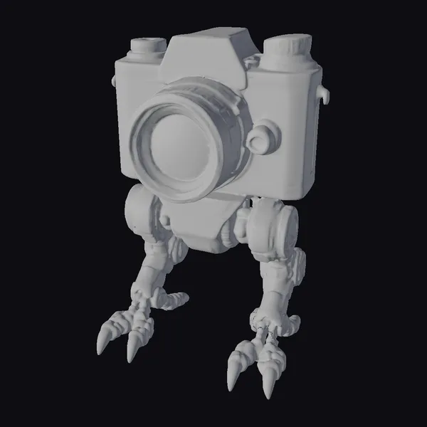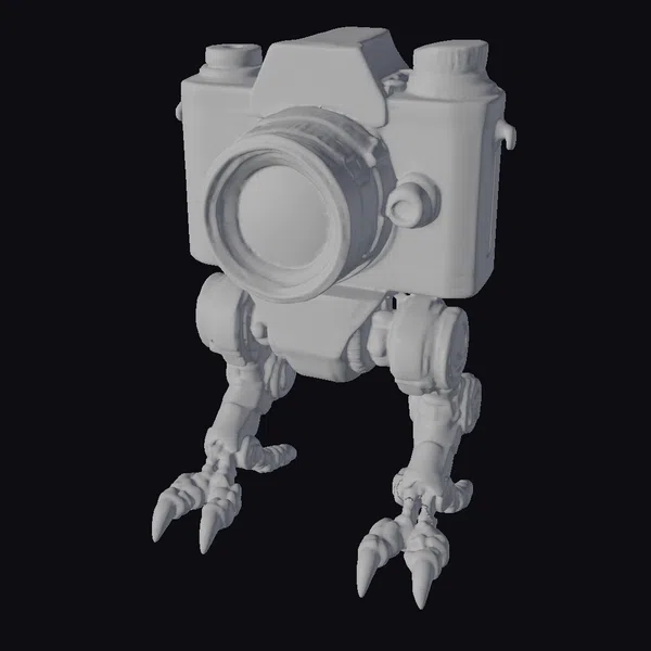 This steampunk camera robot stands poised, its large blue eye gleaming with an otherworldly light. The body of the robot is crafted to resemble an old-fashioned camera, complete with a lens that doubles as a glowing blue orb. The surface of the robot is richly detailed with etched patterns that suggest a blend of Victorian elegance and industrial functionality. Three mechanical legs, each ending in sharp claws, provide stability and a menacing edge to the robot’s design. The overall aesthetic is one of advanced technology merged with antique charm, perfect for projects that demand a touch of steampunk flair. Whether you’re working on a game, animation, or architectural visualization, this model can add a unique character to your scene.
