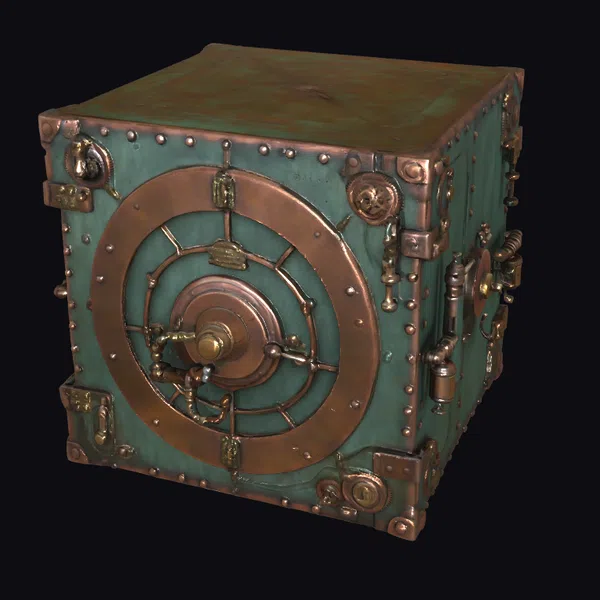Perched on a stark white background, the steampunk safe box commands attention with its imposing presence. The box’s body is a rich green, complemented by copper accents that have developed a warm, golden patina over time. A large, circular dial dominates the front, surrounded by concentric copper rings and a series of rivets that add to the box’s rugged charm. As light dances across its surface, the box seems to whisper tales of forgotten eras and hidden treasures. Whether used in games, 3D printing, VR/AR experiences, or animation, this model is sure to add a touch of steampunk flair. Designers and artists will appreciate the intricate details, from the subtle texture of the copper to the worn, vintage look of the green finish.