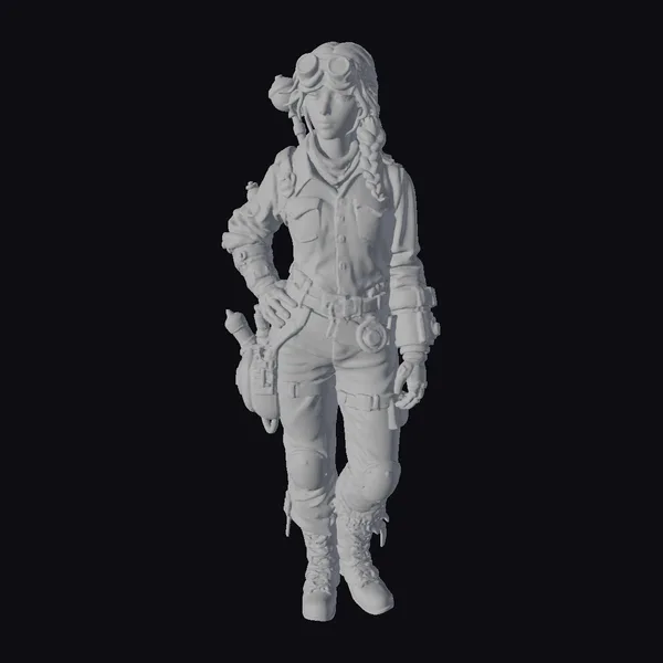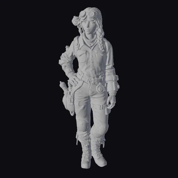 Standing tall with one hand on her hip and the other grasping an unseen object, this steampunk adventurer embodies a spirit of daring discovery. Her outfit is a marvel of mixed materials: the orange jumpsuit with fur-trimmed cuffs and collar, complemented by a brown leather belt, knee pads, and elbow guards. Goggles rest on her forehead, and a tool-laden pouch hangs at her side. This model is perfect for bringing a touch of steampunk flair to games, animations, or 3D print projects. The intricate details, from the braided hair to the buckles on her boots, invite the viewer into a richly textured world of science fiction and fantasy.