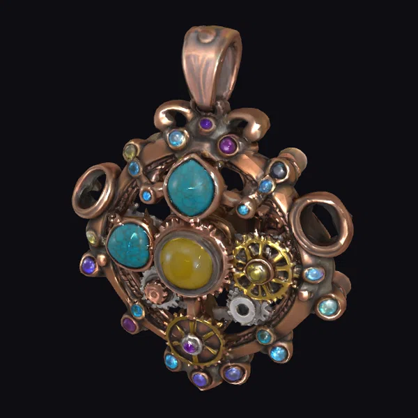 Crafted with meticulous attention to detail, this steampunk pendant boasts a robust copper construction, adorned with an assortment of colorful gemstones in turquoise, yellow, purple, and blue hues. The pendant’s intricate design showcases a beautiful blend of industrial and Victorian elements, complete with exposed gearwork and ornate filigree. The copper base provides a warm, earthy tone that complements the vibrant gemstones, while the gearwork details add a sense of mechanical sophistication. This pendant is perfect for adding a touch of steampunk flair to any outfit, and its intricate design makes it an excellent choice for 3D printing, animation, or game development projects.