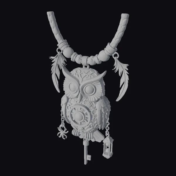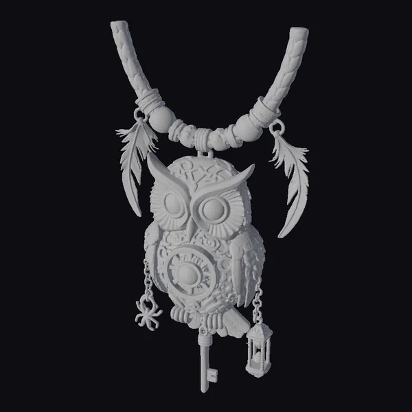 Perched atop a richly textured, brown leather cord, this stunning steampunk owl pendant boasts an impressive array of visual details. The owl’s body is rendered in a warm, brass hue, with a mesmerizing mosaic of blue gemstones adorning its chest and eyes. Two delicate feathers, crafted from a combination of metal and glass, dangle from either side of the cord, while a diminutive key and lantern charm hang from the owl’s talons. The pendant’s ornate design makes it perfect for use in games, 3D printing, VR/AR experiences, animation projects, or as a design reference. Its unique blend of science fiction and Victorian aesthetics ensures it will add a touch of steampunk flair to any creative endeavor.