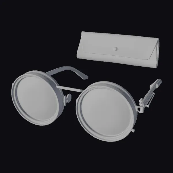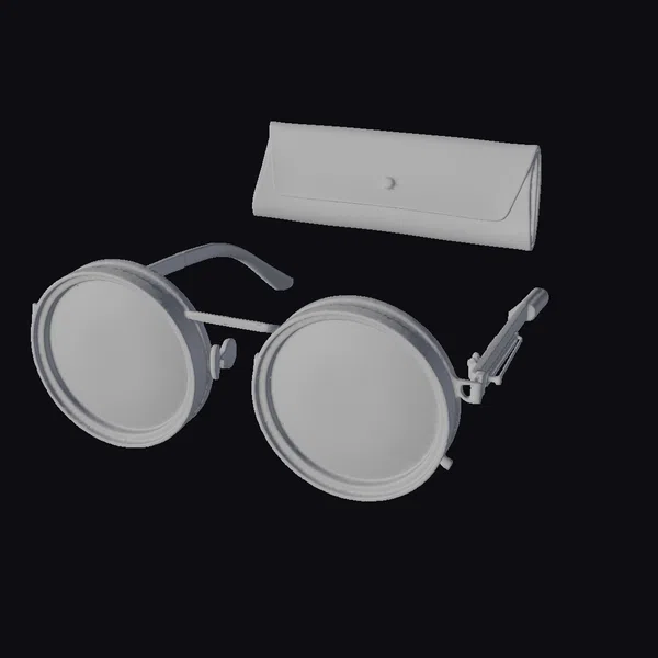 Positioned elegantly against a pristine backdrop, the Steampunk Round Shades boast an intricate design. The round frames, adorned with dark lenses, are accentuated by a subtle gold knob and a flip-up mechanism on the right side. The accompanying black case, complete with a silver snap, adds a touch of luxury. These shades are perfect for games, 3D printing, VR/AR experiences, animation, and design projects, offering a unique blend of style and nostalgia.