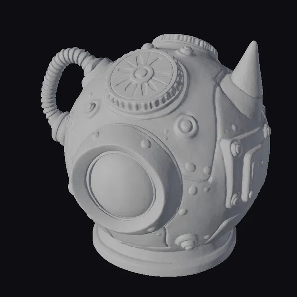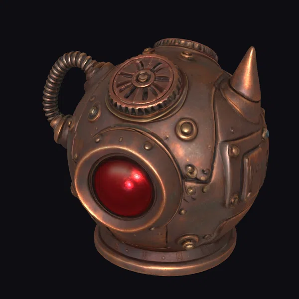 Gaze into the glowing red eye of this steampunk sentinel sphere, a mesmerizing blend of industrial and sci-fi elements. Crafted from copper with intricate details, this model exudes a sense of advanced technology and mystique. The spherical design, complete with a spiral tube and pointed protrusion, adds to its otherworldly allure.