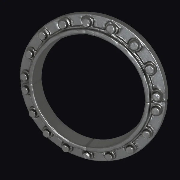 Positioned at a slight angle, the steel ball bearing ring showcases its impressive detail, from the smooth, curved surface of the ring itself to the precisely arranged balls that line its edge. The lighting highlights the metallic texture, emphasizing the durability and strength of the component. The model is rich in details, making it perfect for projects requiring industrial accuracy, such as engineering presentations, technical illustrations, or industrial-themed animations and games. Its realistic appearance allows for a wide range of applications, from educational materials to product visualizations.