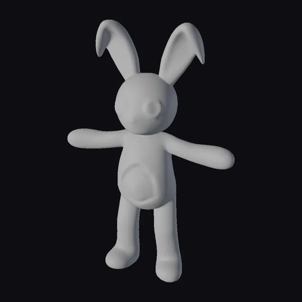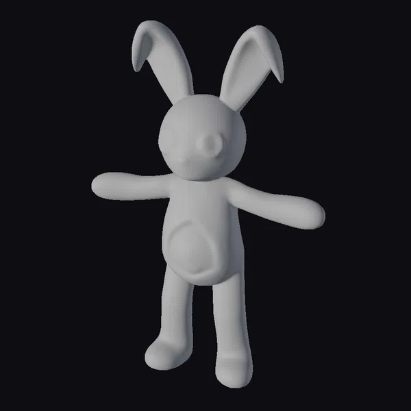 Positioned with its arms outstretched and ears perked up, this stitched bunny toy seems poised to spring into action at any moment. The model’s body is rendered in a warm, tan color with visible stitching throughout, giving it a charmingly handmade appearance. Its large, round eyes are crafted from shiny black buttons, adding a touch of personality to its endearing face. The texture of the bunny’s fabric body appears soft and inviting, with a slightly rumpled look that suggests it’s been well-loved. The stitching details are meticulously rendered, with visible seams running along the arms, legs, and body. This 3D model would be perfect for use in various creative projects, such as games, animations, or 3D printing, where a charming, handmade aesthetic is desired.