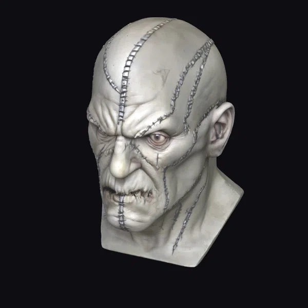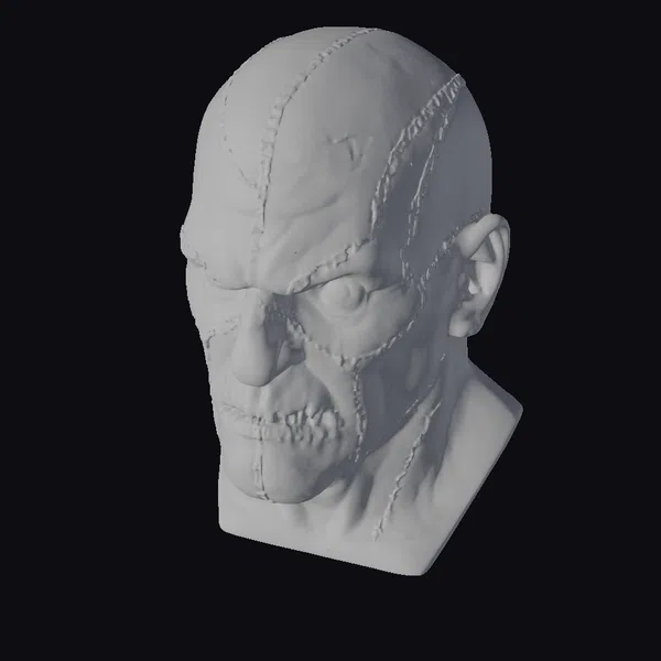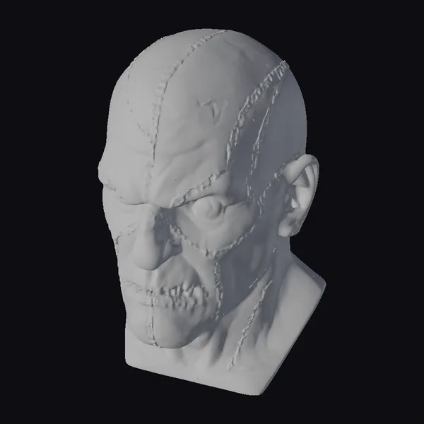 This meticulously crafted 3D model presents a human head bust with a bald scalp and neck, extensively stitched with thick, gray sutures that accentuate the skin’s texture. The face is contorted in a grimace, showcasing a complex network of wrinkles and scars. The left eye is narrowed, while the right appears more open, adding to the unsettling asymmetry. The model is highly detailed, with visible pores and skin texture, making it suitable for projects requiring a realistic, horror-themed character. Ideal for use in games, 3D printing, VR/AR experiences, animations, or designs that require a touch of the macabre.