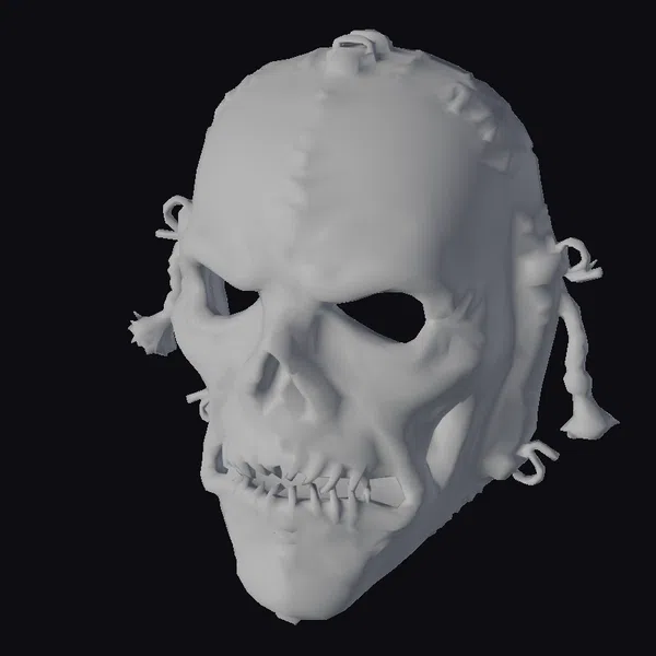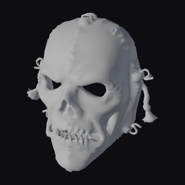 This meticulously crafted stitched skull mask presents a detailed, almost lifelike appearance, with a surface that seems to shift between shades of pale and bloody red. The stitching across the mask, including the mouth area, adds a layer of grim realism, suggesting a creation born from nightmares. The eye sockets are hollow, inviting the wearer’s gaze to pierce through, while the overall design evokes a sense of dark fantasy and horror. The mask’s texture, with its subtle hints of wear and tear, suggests it’s been through a battle, enhancing its macabre appeal. Ideal for use in horror games, animations, or as a prop in film and theater, this model brings a touch of the macabre to any project.