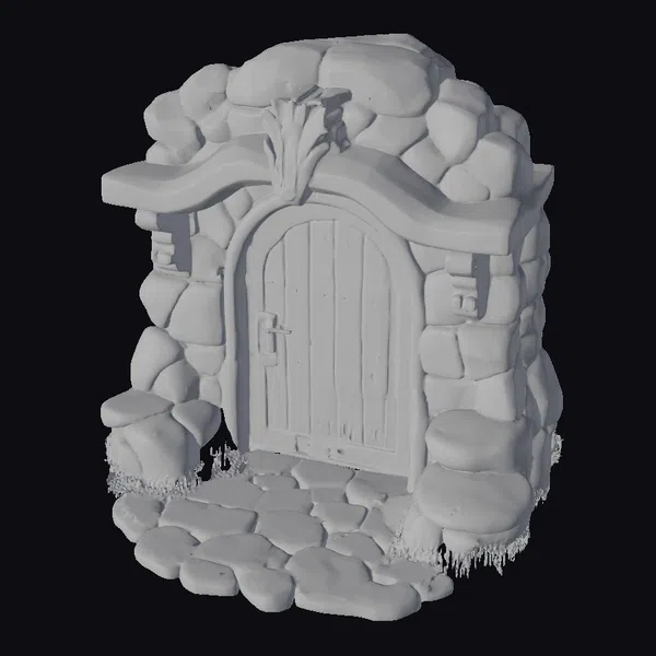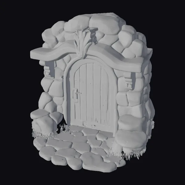 Crafted with meticulous attention to detail, this enchanting stone and wood hearth entrance invites you to explore a world of fantasy. The wooden door, adorned with a sturdy metal handle, is nestled within a sturdy stone archway, complete with a wooden lintel and a delicate stone pathway leading up to it. The subtle addition of moss and grass adds a touch of natural beauty to this charming scene. Ideal for use in games, animation, or 3D printing, this model is sure to transport your audience to a world of wonder.