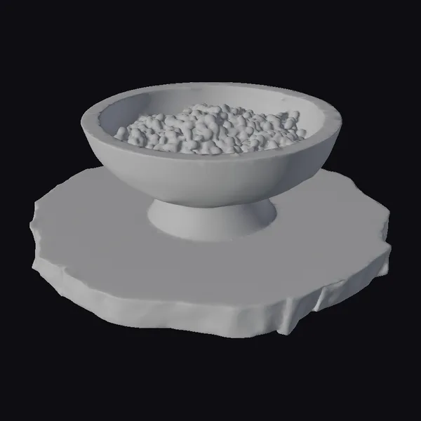 Crafted with attention to detail, the brazier features a sturdy base that seamlessly integrates with the octagonal stone platform, its surface adorned with grooves suggesting a meticulous construction process. The bowl of the brazier is filled with small, multicolored stones, adding a decorative element. The entire structure boasts a realistic, earthy aesthetic, making it a perfect addition to outdoor scenes in games, animations, or architectural designs. Its realistic texture and coloration bring a natural, organic feel to any environment.