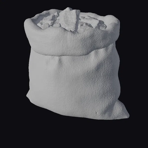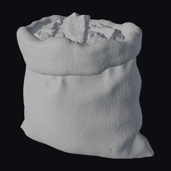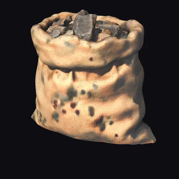 Perched precariously on its base, the burlap sack exudes a sense of rugged utility. The fabric, a mesh of coarse threads, is stained and frayed, with dark spots and tears that tell a story of extensive use. A mishmash of gray and brown stones, some jagged and others rounded, spills from the top, as if freshly gathered. Light catches the sack’s creases, accentuating its three-dimensional texture. Ideal for scenes requiring an element of realism, such as historical or survival game environments, this model can also serve in architectural visualizations where rustic charm is desired. Its detailed appearance makes it suitable for close-up shots in animations or detailed renderings in design projects.